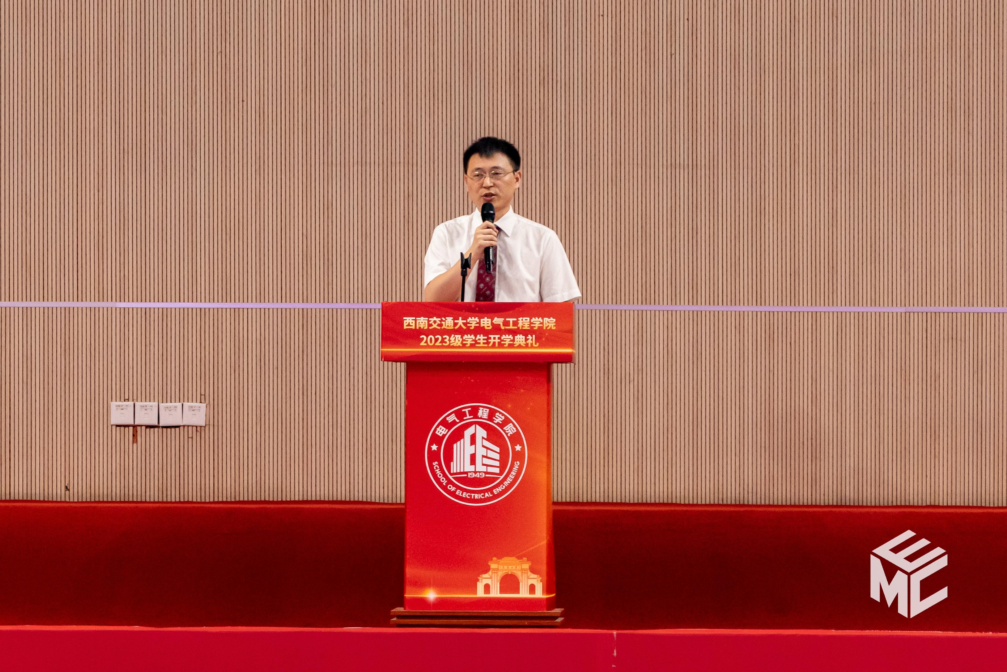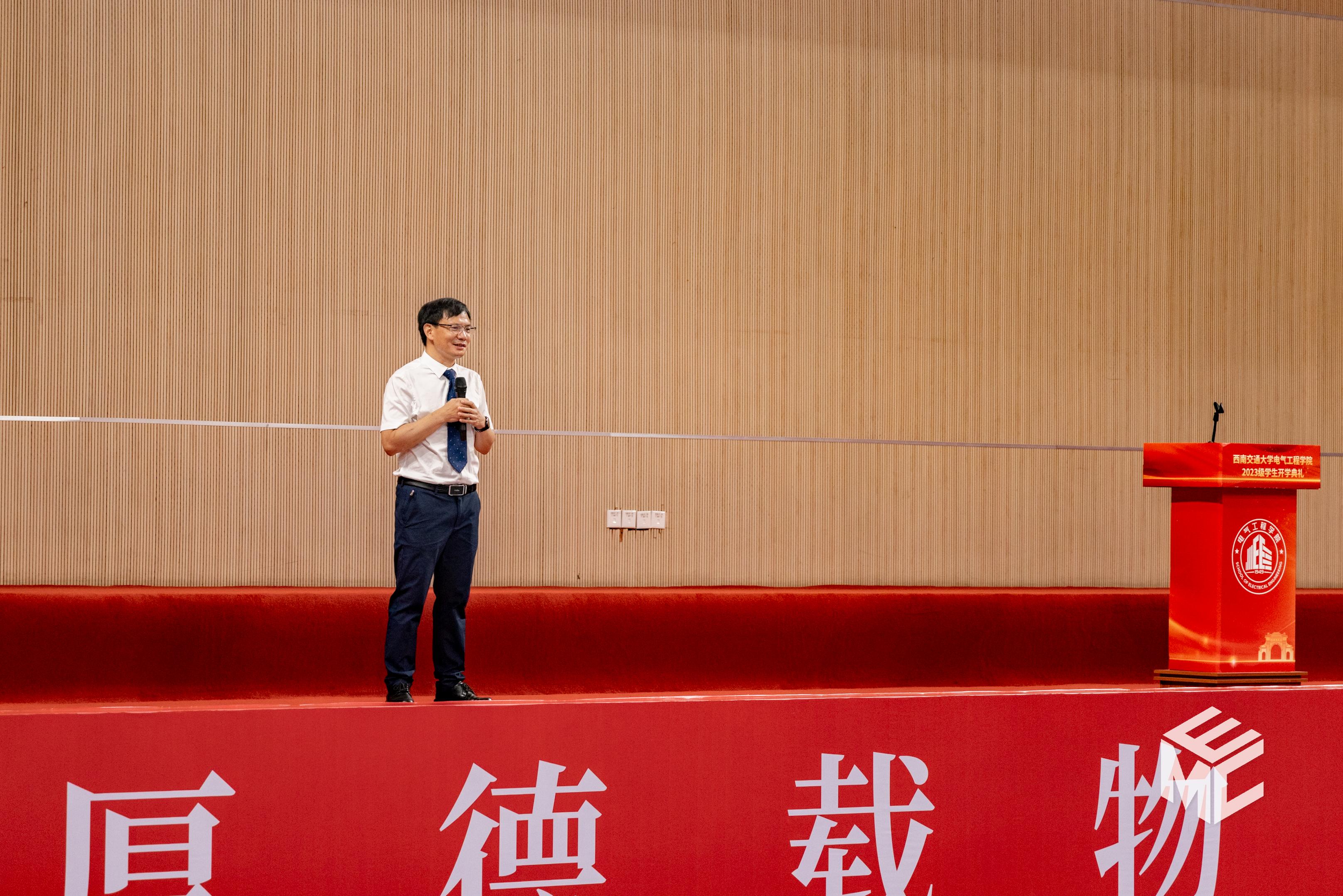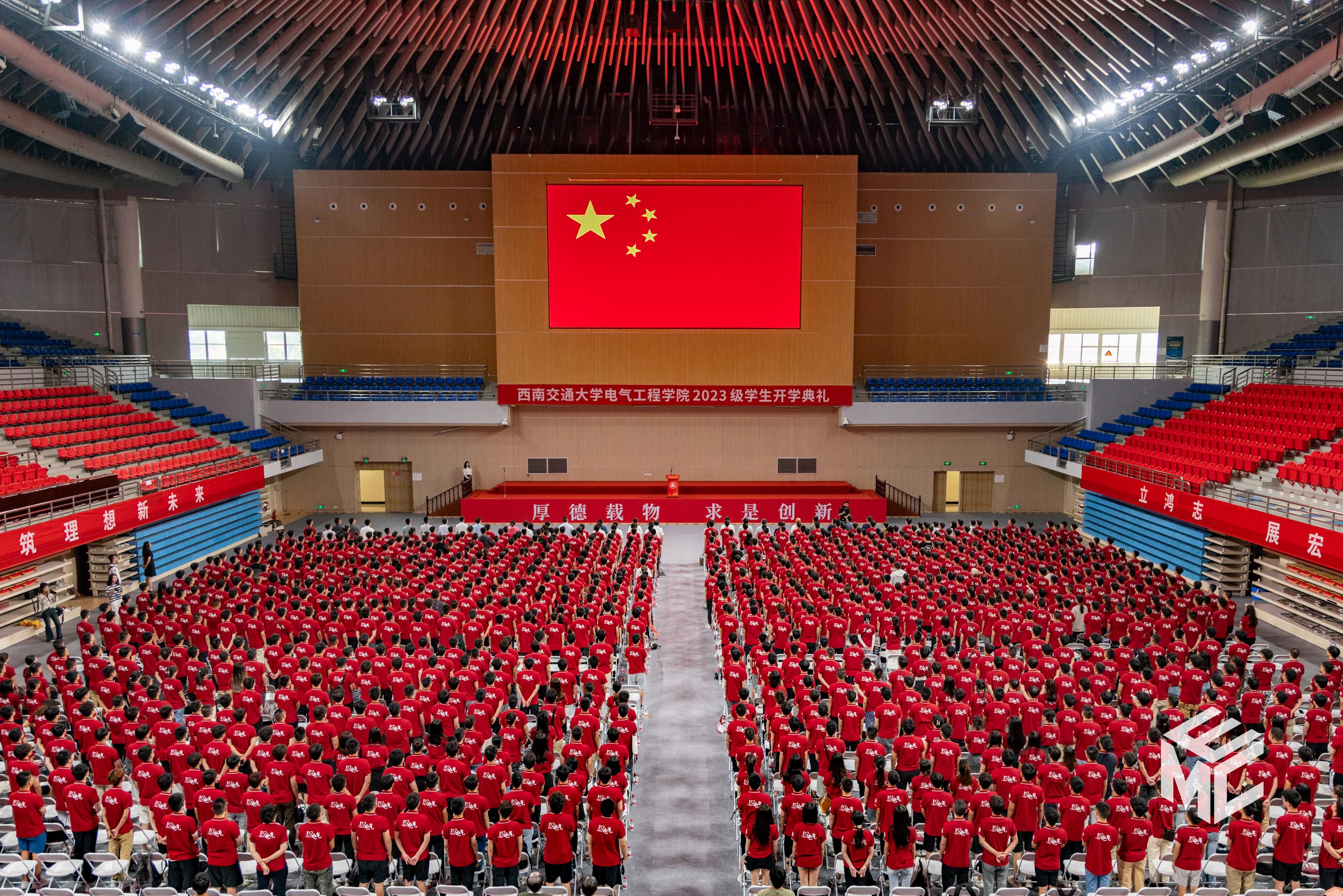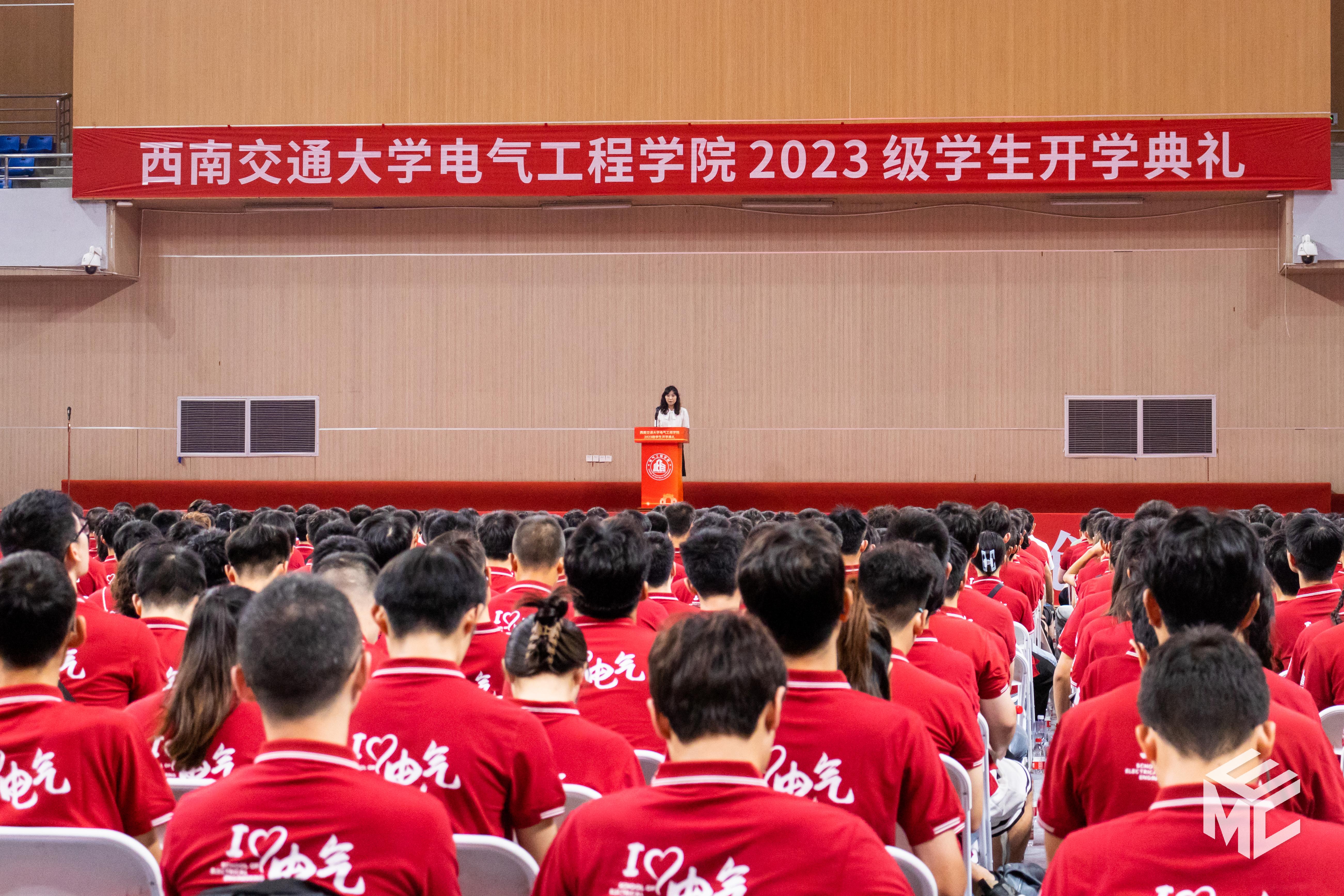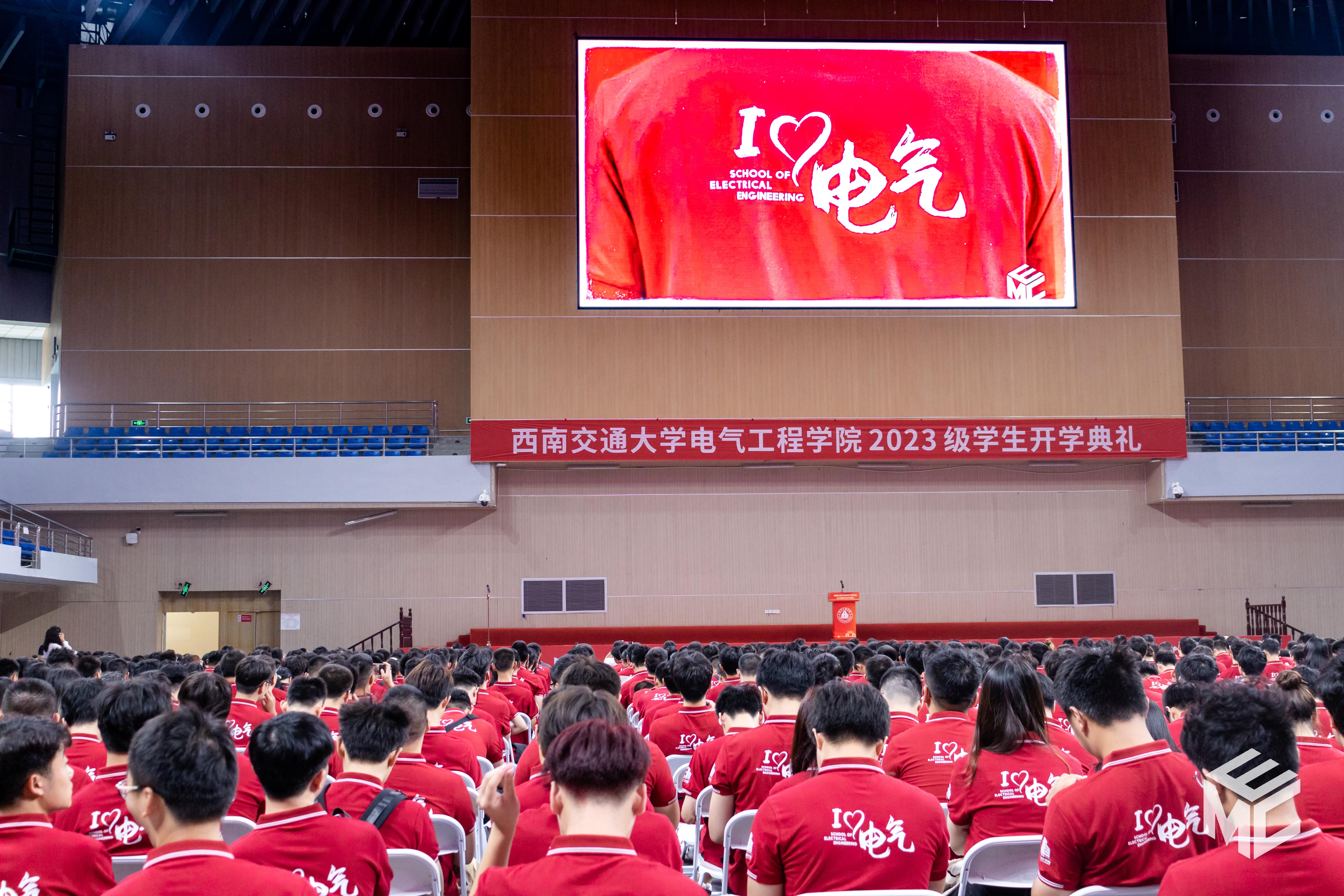 2023年9月3日上午10点,电气工程学院2023级学生开学典礼在犀浦校区飞碟体育馆顺利举行。电气工程学院院长何正友,党委副书记谢力、王轶,副院长陈民武、胡海涛、刘志刚,院长助理黄德青,电力工程系系主任吴积钦,电工电子系系主任卿安永,办公室主任樊兵兵,学生支持办公室主任张婷婷,团委书记张异,2023级本科班导师,2023级全体本硕博新生参加开学典礼。典礼由谢力副书记主持。
