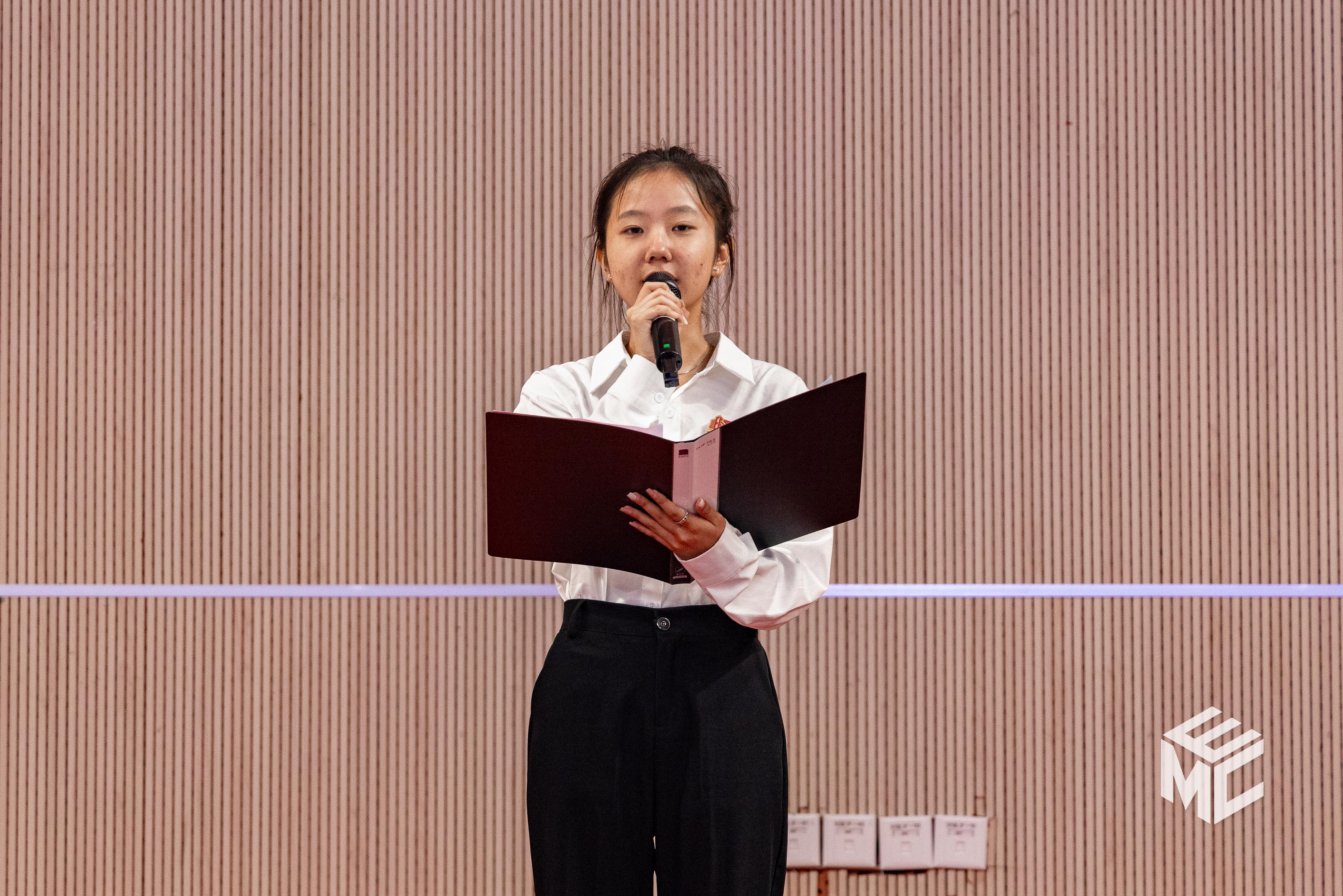 何正友院长为2023级辅导员助理颁发了“《电气传承》讲述人”聘书,同时廖柯琳同学为大家讲述了《曹老的四次抉择》。廖柯琳同学深情的讲述使同学们深刻领悟了曹老精忠报国、开拓创新、勇于担当的精神。伴随着热烈的掌声,2023级学生开学典礼圆满结束。