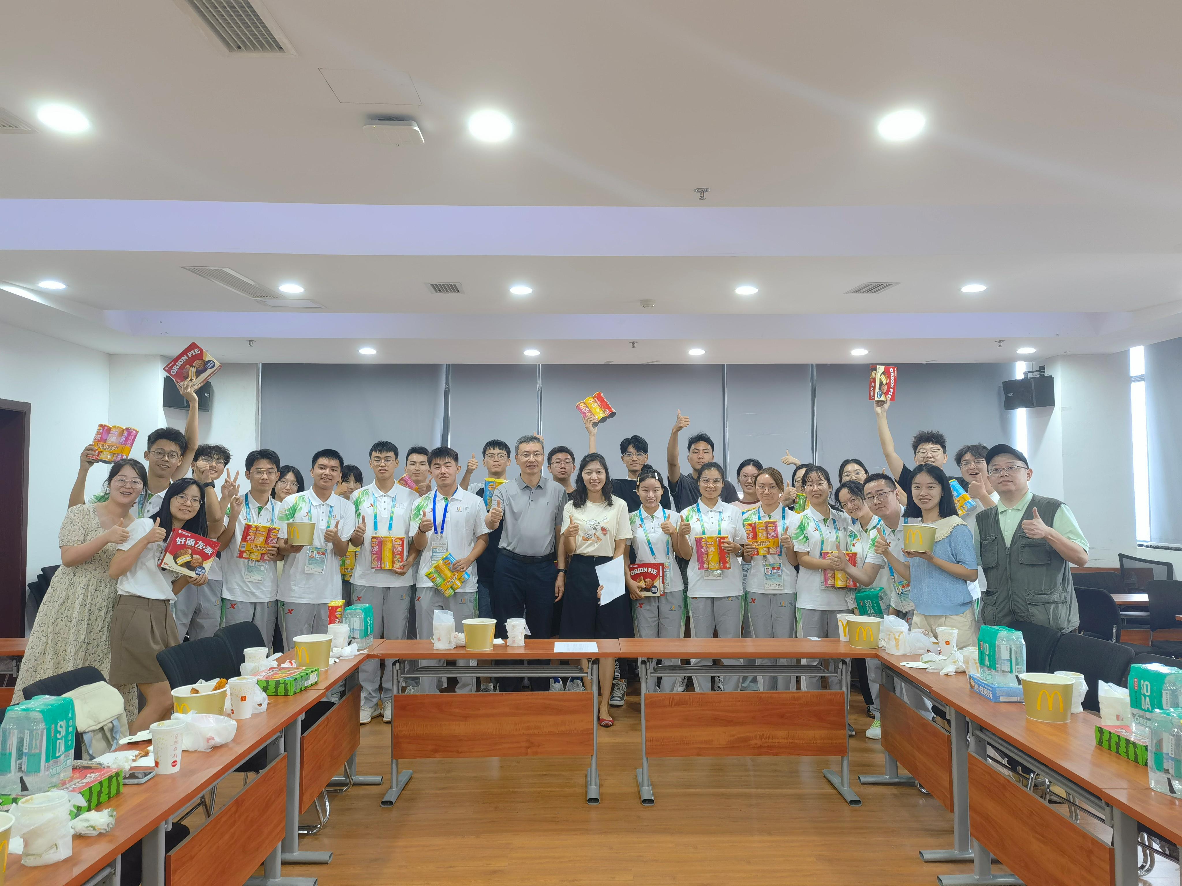 7月25日下午,学院党委书记王斌、党委副书记谢力一同到电气馆832看望我院身处大运会一线的师生代表,和他们亲切交流,了解到岗工作、生活情况,随后共进晚餐,并现场发放零食大礼包。