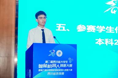 接着,参赛学生代表西南交通大学本科2021级电气工程学院冯洪赟同学发言。他分享了自己的备赛经历,在这一过程中遇到并克服了诸多困难,学习到了许多专业知识,也结交了很多志趣相投的朋友。同时他也讲到,面对智能机器人的快速发展,年轻一代的青年大学生肩负着推动科技进步的责任和使命,有困难但始终不断进步着。