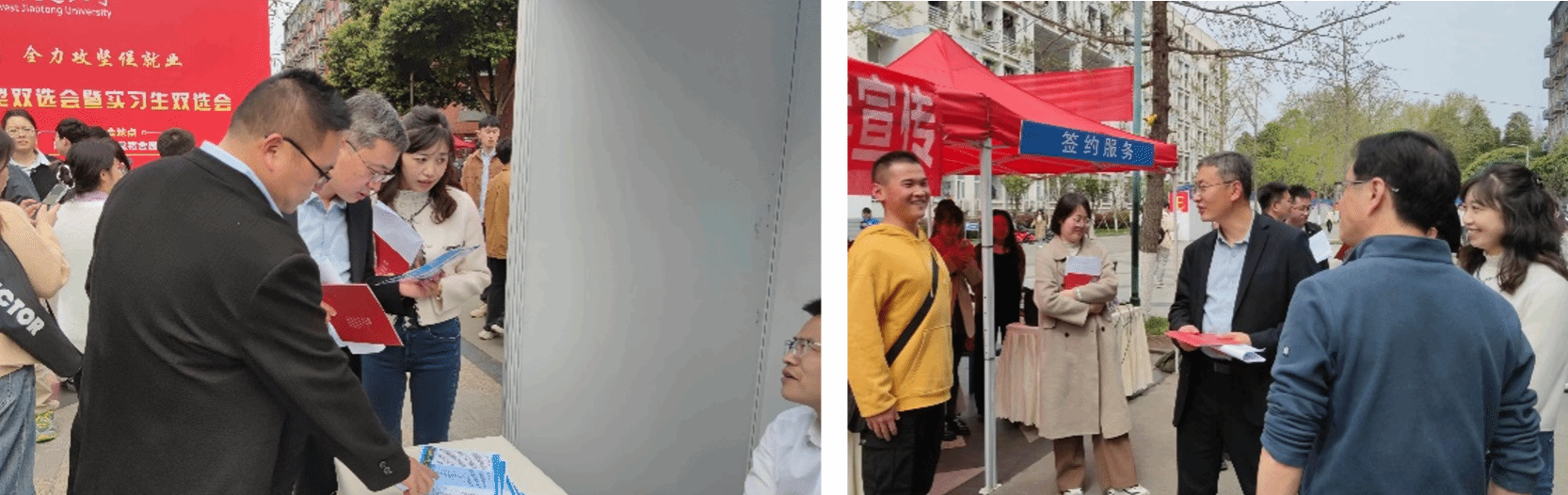 2024年3月26日下午,为抢抓春季促就业关键期,全力促进高校毕业生高质量就业,西南交通大学“送岗进寝系列活动” 2024年春季大型双选会暨实习生双选会在犀浦校区学生园区举行。学院党委书记王斌、党委副书记谢力、学院办公室主任樊兵兵、团委书记张异及毕业班辅导员共同来到双选会现场,深入了解学院毕业生的就业情况,并与用人单位沟通交流。