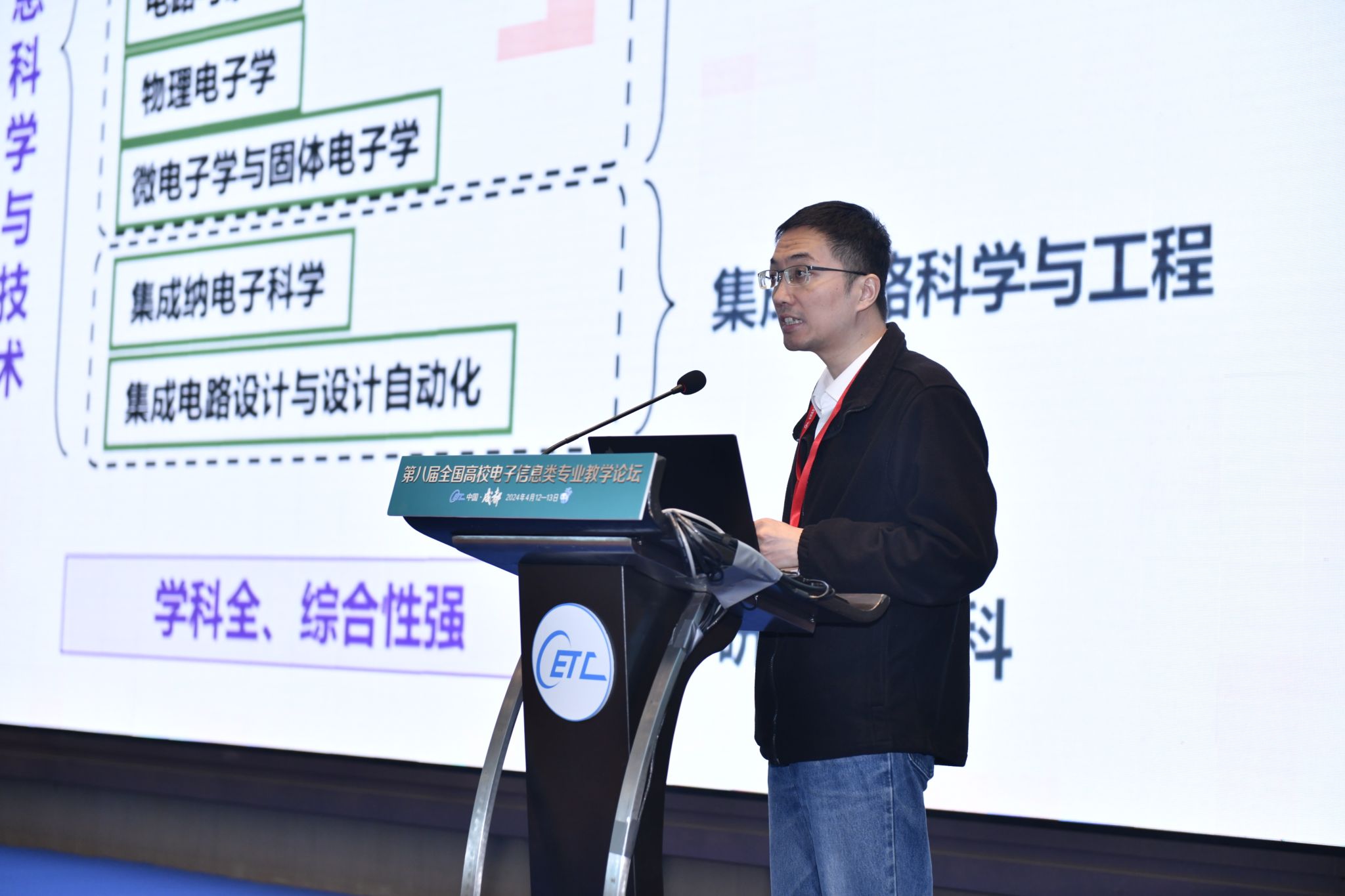西安电子科技大学苏涛教授分享了题为“新时代一流电子信息类专业建设的思考和实践”的报告;他分析了当前高等教育体系存在的一系列问题,并指出专业建设重点在于“体系合理、执行有效”。清华大学李懋坤教授作了题为“电子信息大类人才培养工作介绍”的报告,介绍了清华大学电子信息类专业的课程体系结构、特色实验教学方式、因材施教特色培养项目、电子系人才培养模式等。浙江大学史治国教授作了题为“一流专业建设中核心课程内涵优化的探索与实践”报告,指出课程内涵优化在于构建基本体系、新设必修课程以及课程内涵优化,并介绍了学生培养成效。西南交通大学陈民武教授作了题为“轨道交通电气信息类一流专业建设与创新实践”的报告,介绍了以轨道交通为行业背景的特色专业建设成果、新质生产力背景下新工科建设、产教和科教双融通育人新范式、第一和第二课堂协同育人新探索。