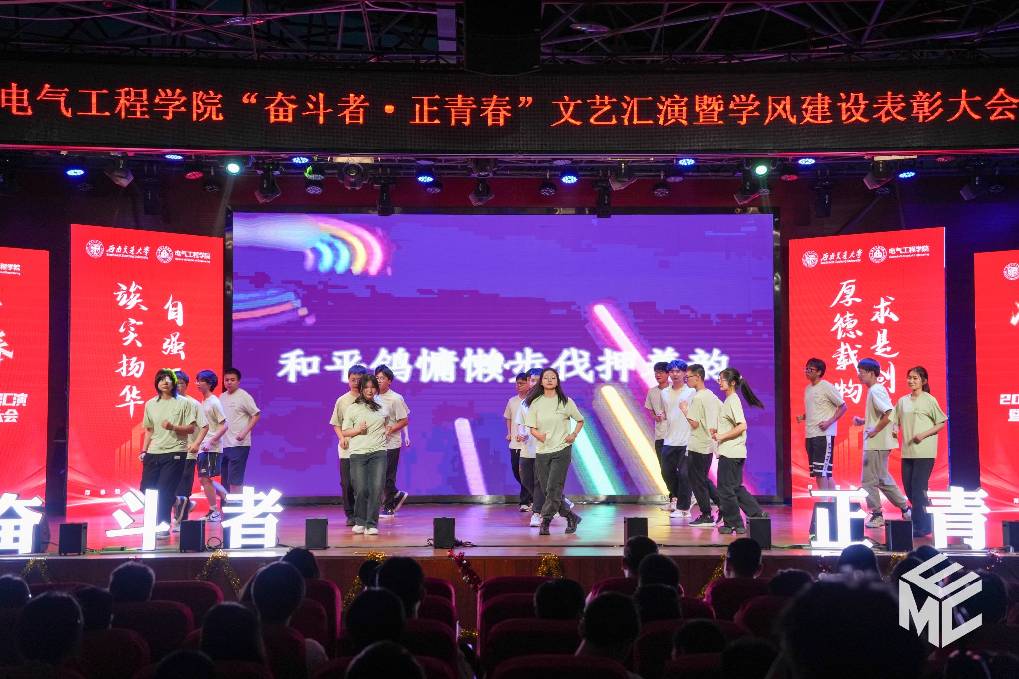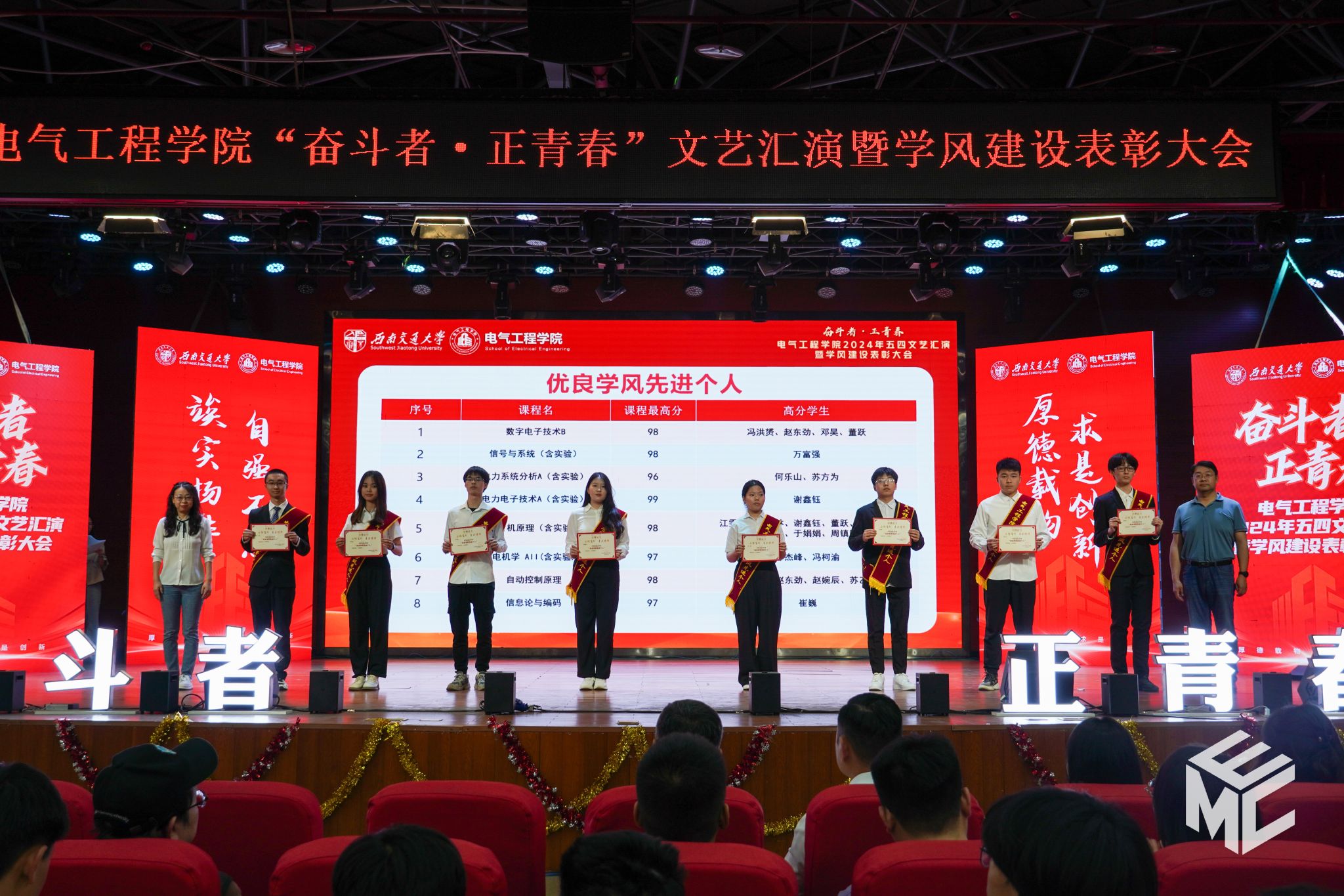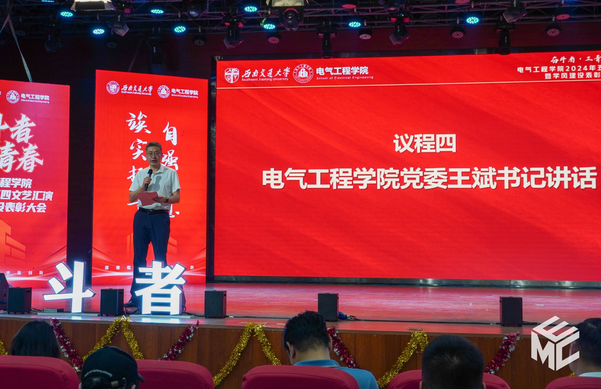 2024年4月27日晚,电气工程学院“奋斗者•正青春”2024年五四文艺汇演暨学风建设表彰大会在犀浦校区大学生活动中心如期举行。西南交通大学团委书记武俊,党委学生工作部副部长邢晓鹏,教务处副处长刘鎏,招生就业处对外联络科科长董鹏飞,电气工程学院党委书记王斌,副院长解绍锋,学院党委副书记谢力、王轶,信承瑞技术有限公司总裁金良赞,信承瑞周钗妹千万光彩基金会理事长林婷婷等出席晚会。2023级班导师及全体辅导员与同学们齐聚一堂,共同参加本次文艺汇演暨表彰大会。