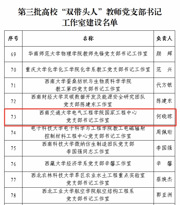 近年来,西南交通大学党委以习近平新时代中国特色社会主义思想为指导,深入贯彻新时代党的建设总要求和新时代党的组织路线,认真落实《中共教育部党组关于加强新形势下高校教师党支部建设的意见》和《中共教育部党组关于高校教师党支部书记“双带头人”培育工程的实施意见》,培育了一批优秀的基层“双带头人”教师党支部书记,在组织建设和教育教学、科学研究等领域充分发挥“头雁”作用,工作成效明显。下一步,学校党委将开展校级党建示范创建和质量创优培育项目,强化培育选树和重点建设,辐射带动学校各级党组织全面进步全面过硬,推进党建工作与学校事业发展深度融合。