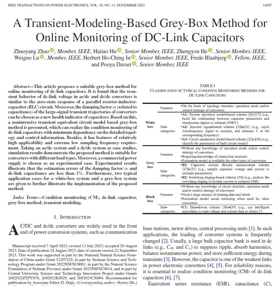 z. zhao, h. hu, z. he, h. h.-c. iu, f. blaabjerg and p. davari, “a transient-modeling-based grey-box method for online monitoring of dc-link capacitors,” in ieee transactions on power electronics, vol. 38, no. 11, pp. 14547-14562, nov. 2023.