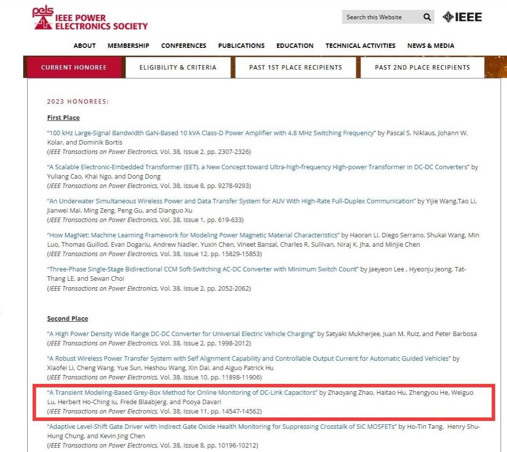 近日,ieee电力电子学会(power electronics society, pels)公布了旗舰期刊ieee transactions on power electronics (tpel)2023年度优秀论文奖(prize paper award)获奖名单。从该刊2023年度正式出版的1364篇论文中评选出一等奖(first place prize paper)5篇、二等奖(second place prize paper)9篇和优秀快报(prize letter)2篇。学院何正友、胡海涛教授团队论文《a transient modeling-based grey-box method for online monitoring of dc-link capacitors》荣获2023年度优秀论文二等奖。