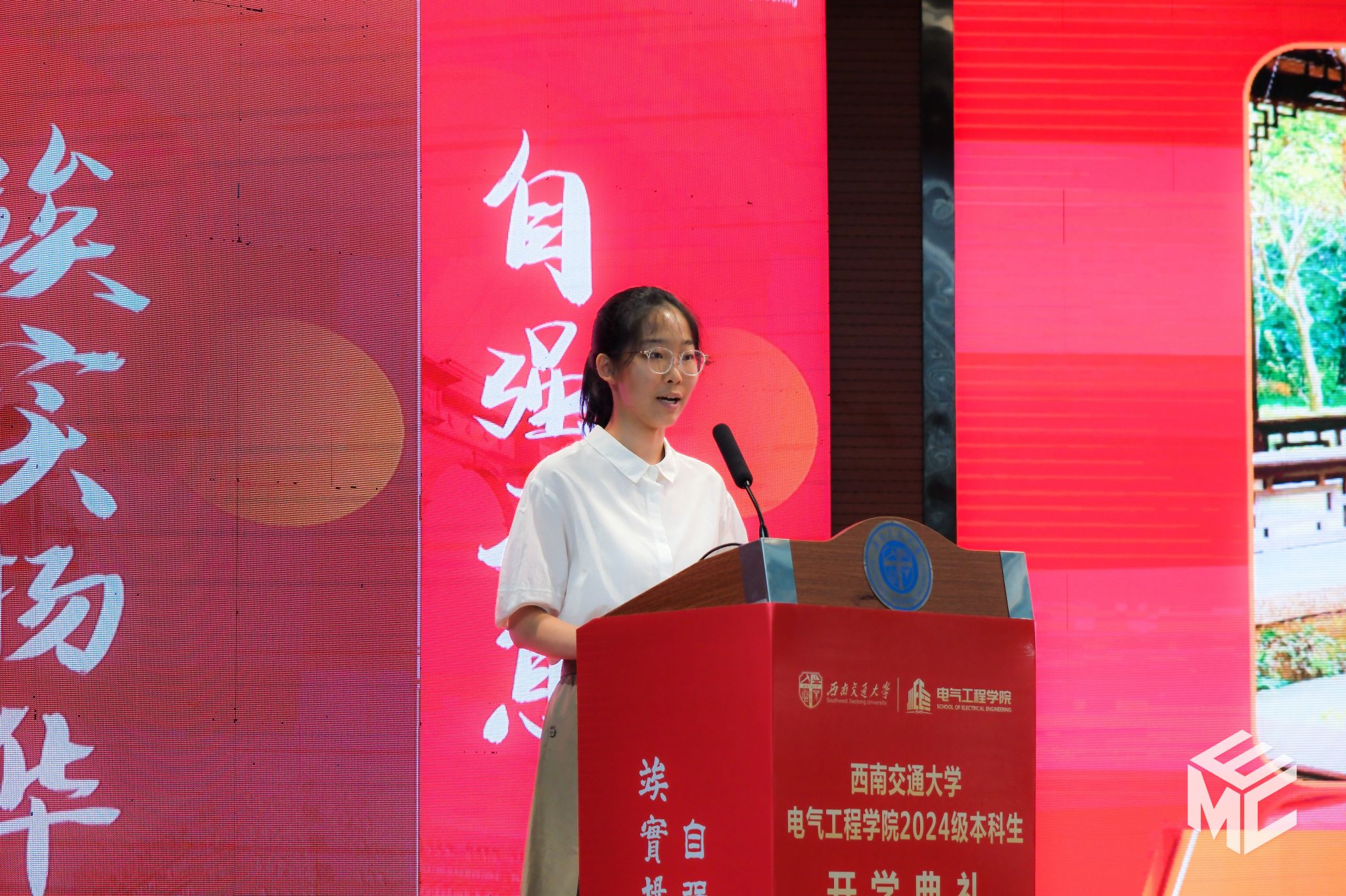 电气(茅班)2024-01班阎昱彤同学作为新生代表上台发言。阎昱彤分享了自己进入交大以来的感受,入学的两周充实而精彩,辅导员老师的暖心关怀、军训期间的骄阳与汗水、新生入学教育的丰富内容,都让同学们印象深刻。随后,阎昱彤与全体新生共勉三点感悟:一是认真学习,拒绝摆烂躺平。大学是人生的新起点。同学们应在新的坐标上为自己准确定位,用专业知识武装自己。二是健康生活,不做脆皮大学生。同学们应规律作息,合理饮食,科学锻炼。三是奉献担当,锤炼个人本领。同学们要向优秀学长看齐,积极参加各项活动,在班级、社团中脚踏实地做事,成长为全面发展的优秀人才。