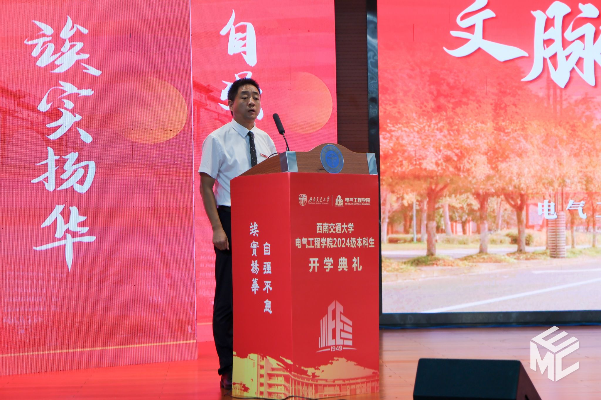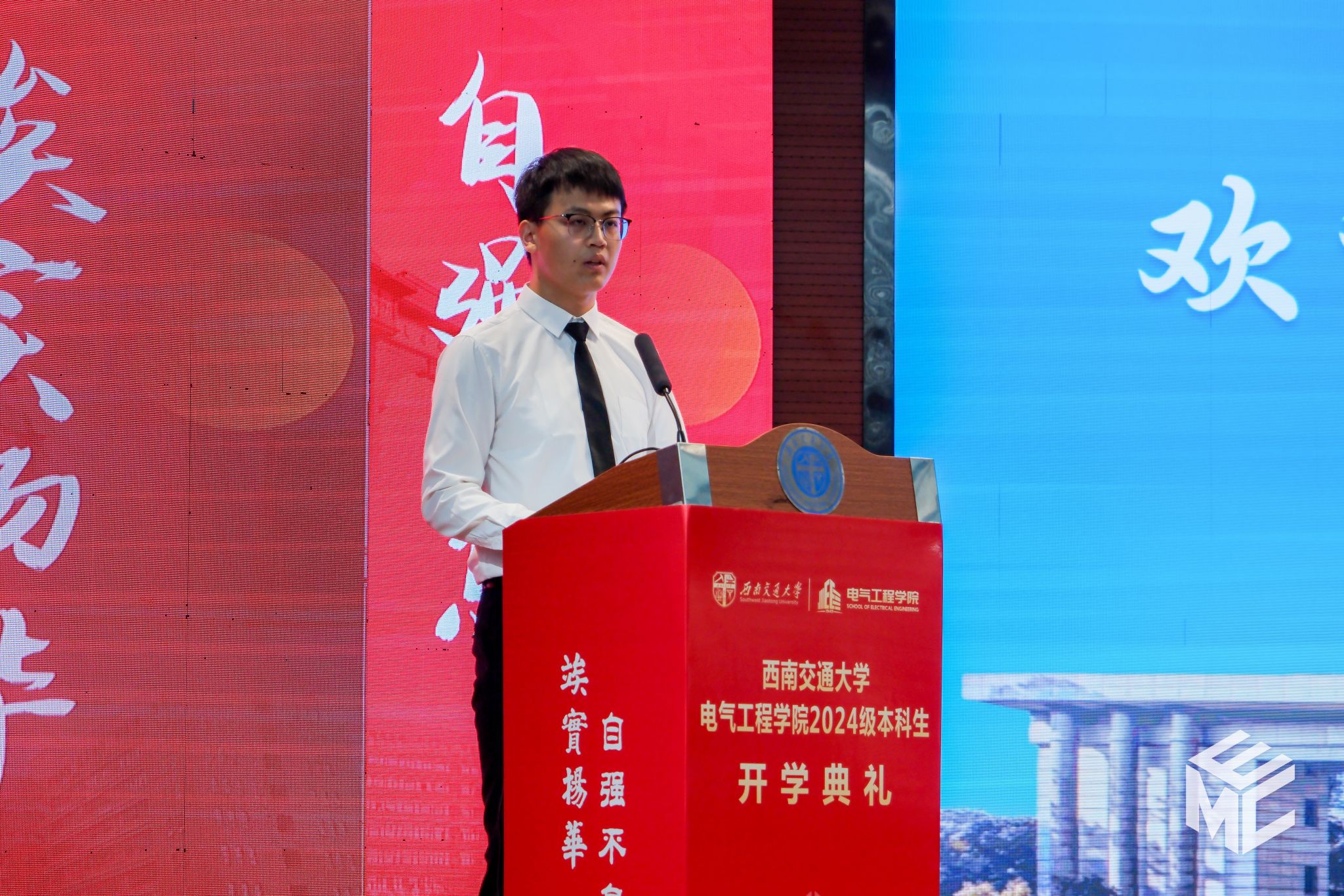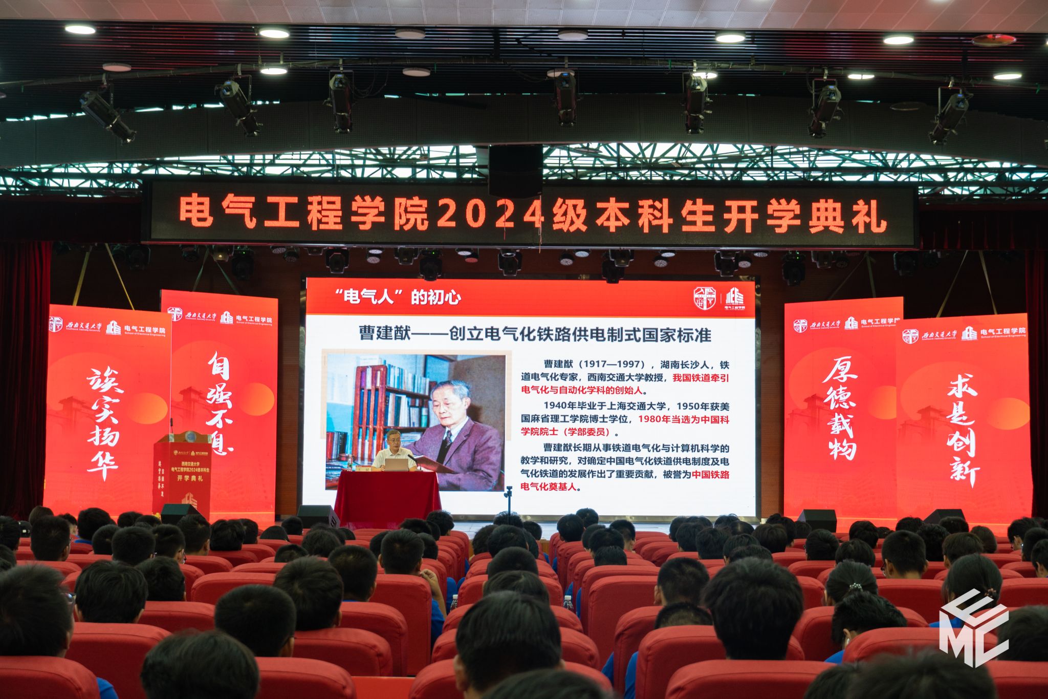 在开学典礼的第二阶段,王斌书记为2024级新生讲授题为《电气人的初心和使命》的新生思政课。王斌书记回顾了学院与祖国和人民同呼吸、共命运的办学历史,列举了三代电气人为国家轨道交通电气化事业发展而接续奋斗的实例。从初创期、发展期到未来期,学院凝练了“赤”热之心的矢志不渝,让一代代交大电气人的心中饱含“赤”诚之情。