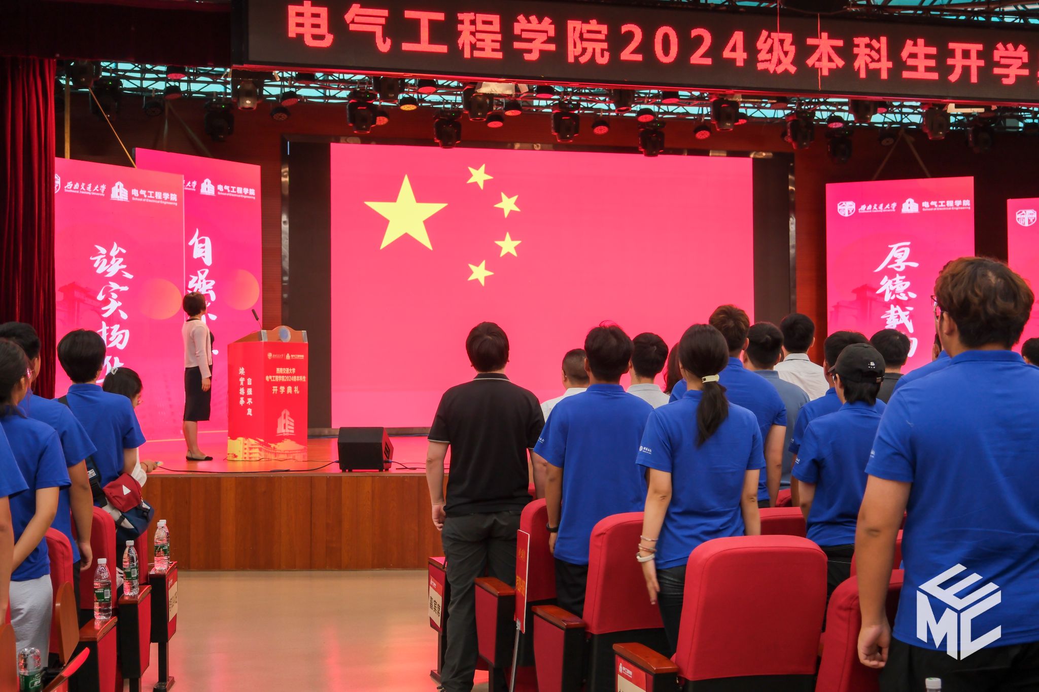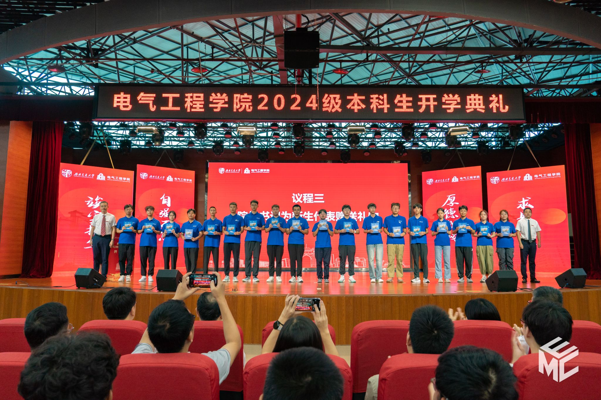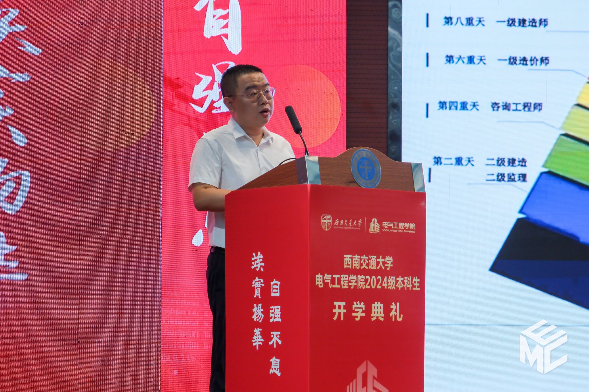 在开学典礼的第二阶段,王斌书记为2024级新生讲授题为《电气人的初心和使命》的新生思政课。王斌书记回顾了学院与祖国和人民同呼吸、共命运的办学历史,列举了三代电气人为国家轨道交通电气化事业发展而接续奋斗的实例。从初创期、发展期到未来期,学院凝练了“赤”热之心的矢志不渝,让一代代交大电气人的心中饱含“赤”诚之情。