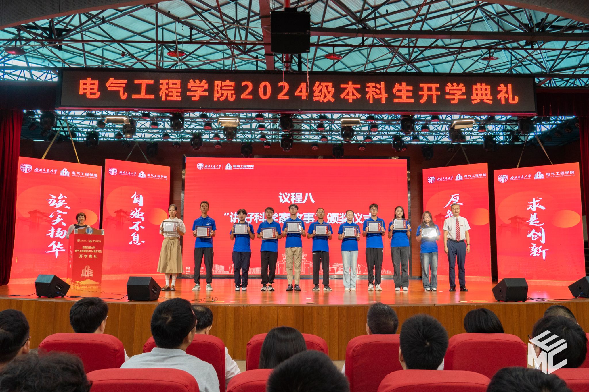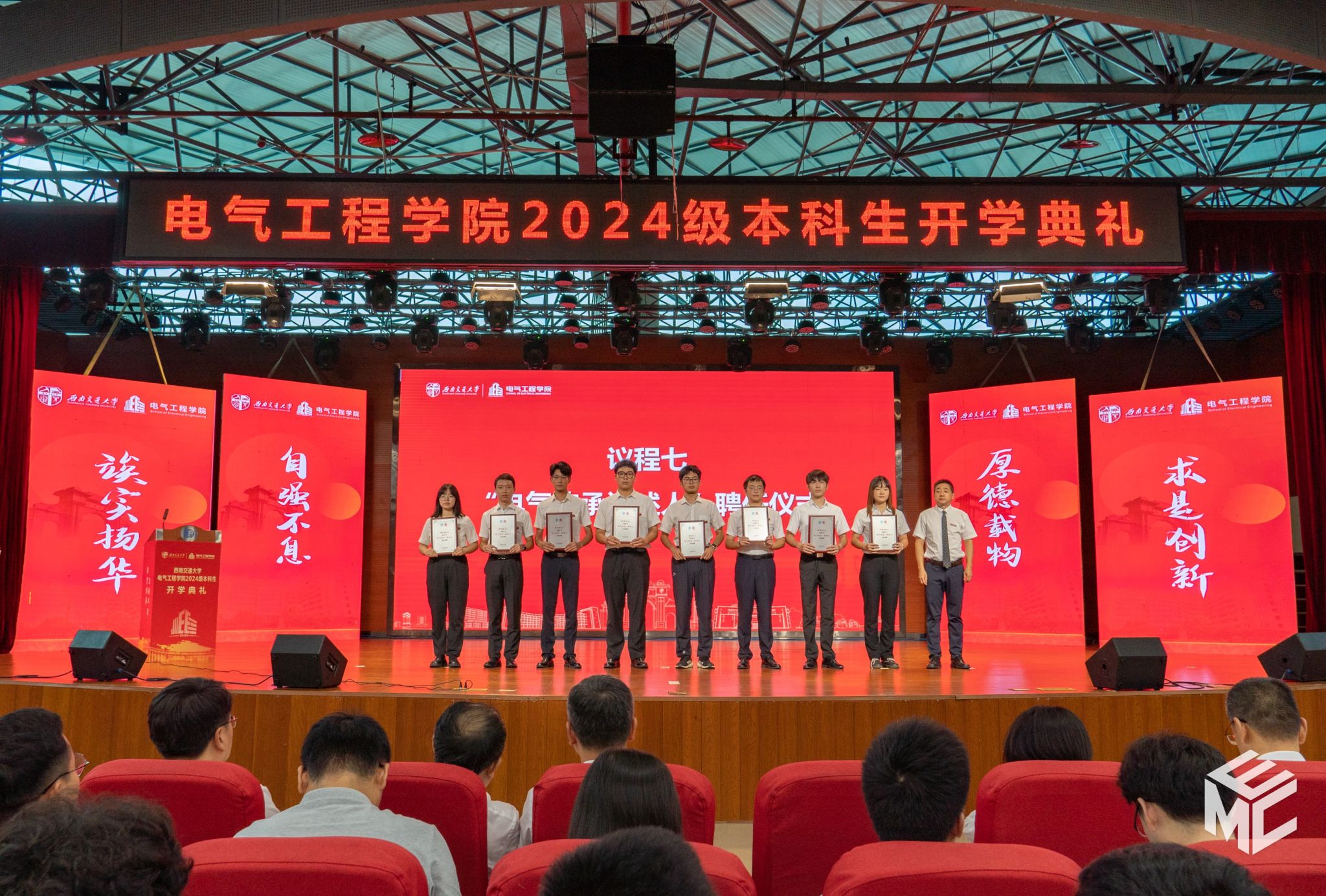 为深入学习贯彻习近平总书记对思政课建设的重要指示,弘扬中华优秀传统文化,讲好“科学家故事”,在2024级本科生开学典礼上,马光同院长为第三批“电气传承讲述人” 管烊堃、林俊宏、徐陈琳、黄俊枫、盛业、李鸿、徐楷瑞、刘麒玥颁发聘书。