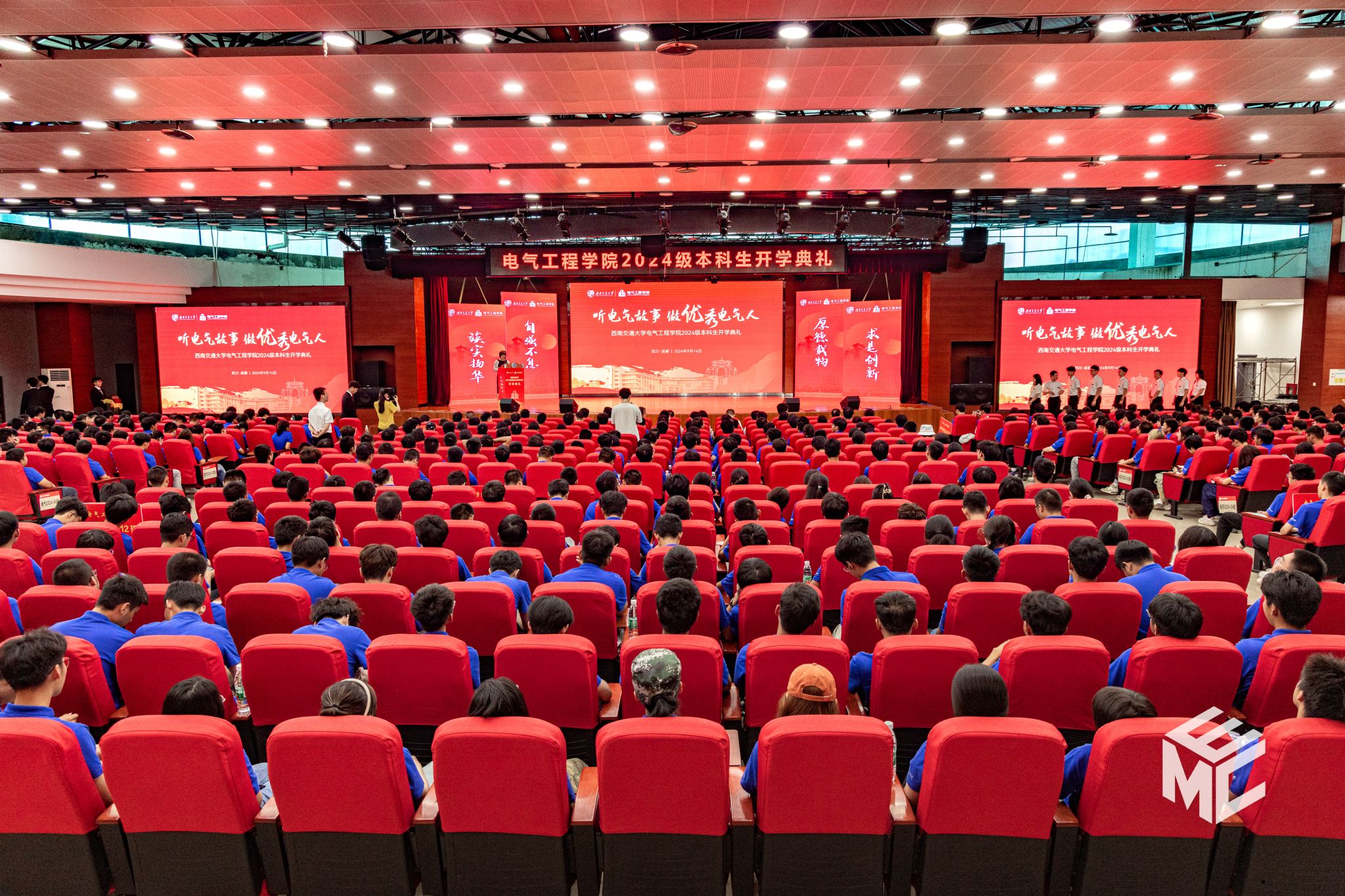 2024年9月14日上午9时,电气工程学院2024级本科生开学典礼于犀浦校区二食堂三楼大学生活动中心顺利举行。电气工程学院院长马光同,党委书记王斌,党委副书记、副院长、纪委书记王轶,党委副书记邢晓鹏,副院长解绍锋、刘志刚,院长助理韩莹,电工电子系系主任严仲明,电力电子与电力传动系副系主任葛兴来,学生支持办公室主任张婷婷,教师服务中心办公室副主任林静英,中铁电气化局集团有限公司城铁公司成都区域项目常务副经理、成都27号线供电系统项目经理、校友代表张凯,2024级本科班导师,全体辅导员老师以及2024级全体本科新生参加开学典礼。典礼由团委书记张异主持。