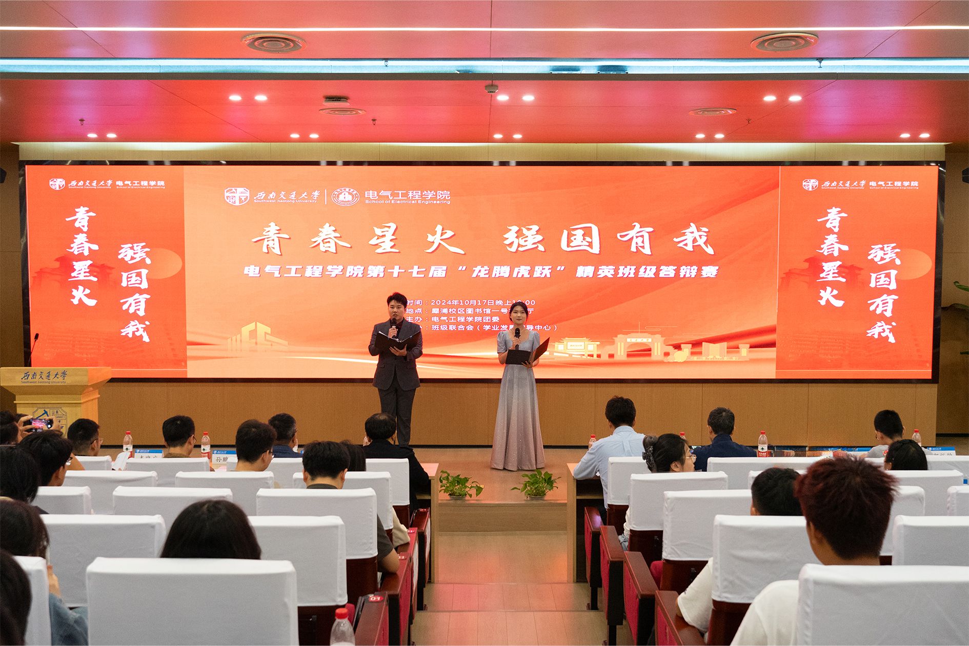 2024年10月17日晚上19时,由电气工程学院团委主办,电气工程学院班级联合会(学业发展指导中心)承办的西南交通大学电气工程学院第十七届“龙腾虎跃”精英班级答辩赛于犀浦校区图书馆一号报告厅正式拉开序幕。学院党委副书记邢晓鹏、教学工作主管韩莹、团委书记张异、入围班级班导师以及各年级辅导员共同出席本次精英班级答辩赛。此外,学院本科2024级全体新生班委也来到答辩现场,向参加答辩赛的13个优秀班级学习经验。