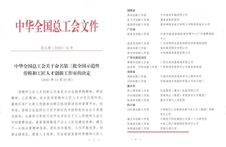 2021年,李群湛教授创新工作室被授予全国示范性劳模和工匠人才创新工作室称号