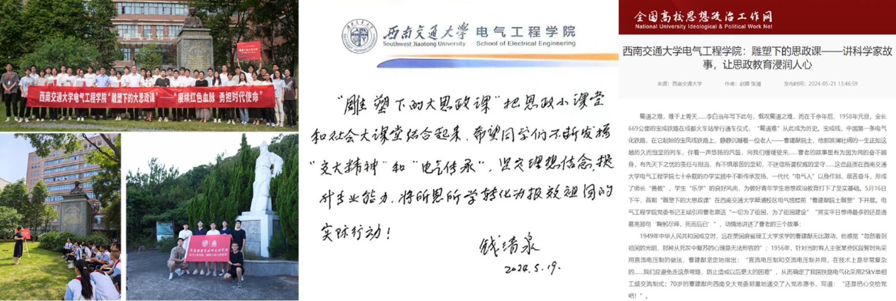 学院党委严格落实学校思想政治工作有关要求,定期开展思想政治工作专题研判,坚持用党的科学理论武装青年。常态化开展师生理想信念教育、廉洁教育、纪律教育和警示教育,学院党政主要负责人每学期在入党积极分子培训、教职工大会等活动中坚持为师生讲党课;举办首届“四川电力青年说”、承办“最美铁路人”先进事迹巡回报告会等活动,持续凝练电气文化,深度融入师生思想政治教育,强化“赤电”文化建设,着力构建电气特色的“大思政”育人体系。