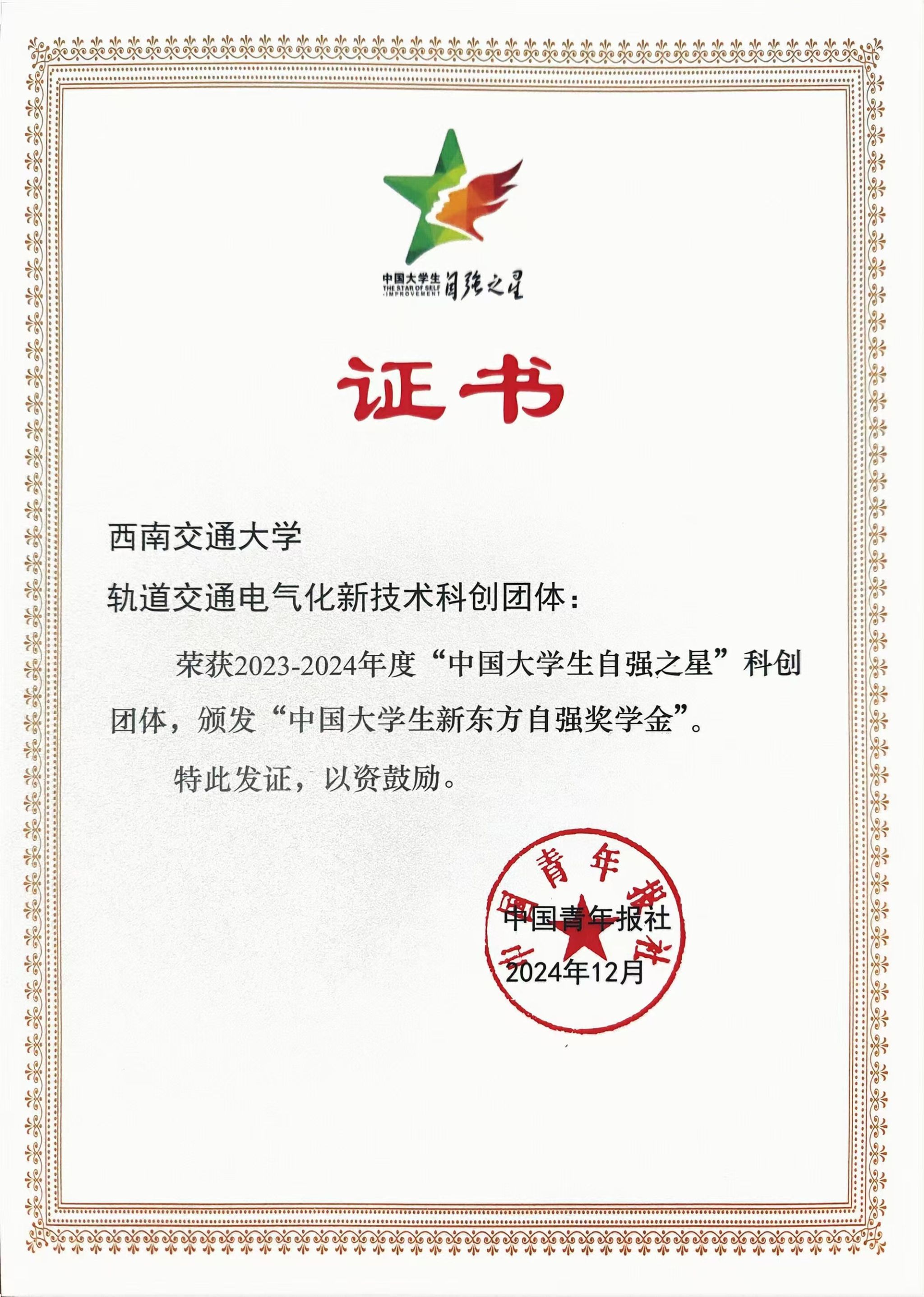 2023-2024年度“中国大学生自强之星”奖学金推报活动由共青团中央、全国学联指导,共青团中央基层建设部、中国青年报社、新东方教育科技集团、中国青年创业就业基金会联合举办。活动以“自信自强挺膺担当”为主题,旨在树立当代大学生中热爱祖国、品行优良、不畏艰难、自强不息的榜样。经各高校(市州)推荐、省级初评、拟推荐人选公示等环节,西南交通大学电气工程学院轨道交通电气化新技术科创团体荣获2023-2024年度“中国大学生自强之星”科创团体(全国仅100支科创团体获得该荣誉)。该科创团体成员共41人,其中教师8人,在校学生33人。