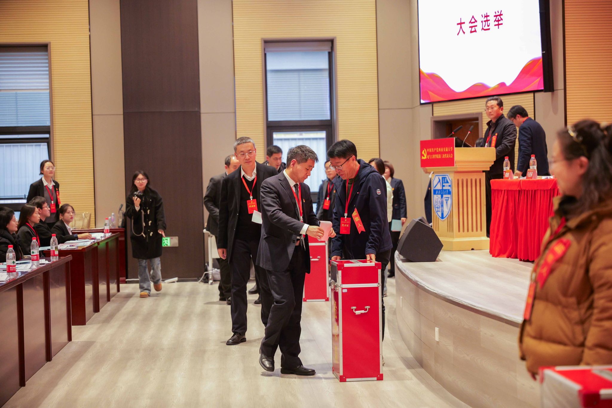 7日14时45分,大会在庄严的国歌声中开幕。会场内雄伟庄严、气氛热烈,主席台上方中央悬挂着“中国共产党西南交通大学电气工程学院第三次代表大会”的会标,大厅正中央的中国共产党党徽在红旗的映衬下熠熠生辉。