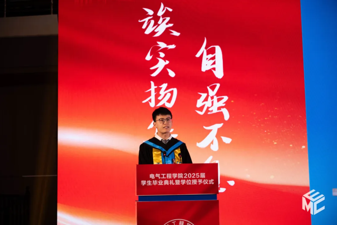 本科毕业生代表冯洪赟上台发言。他回首在学院求学的岁月,特别感谢了师长的悉心培养和同窗的并肩奋斗。作为新时代电气人,冯洪赟表示将牢记“竢实扬华,自强不息”的交大精神,肩负起推动能源革命和产业升级的担当。他号召全体毕业生像银杏树一样顽强生长,在祖国需要的各个领域绽放光彩,用实际行动续写交大电气人的辉煌篇章。