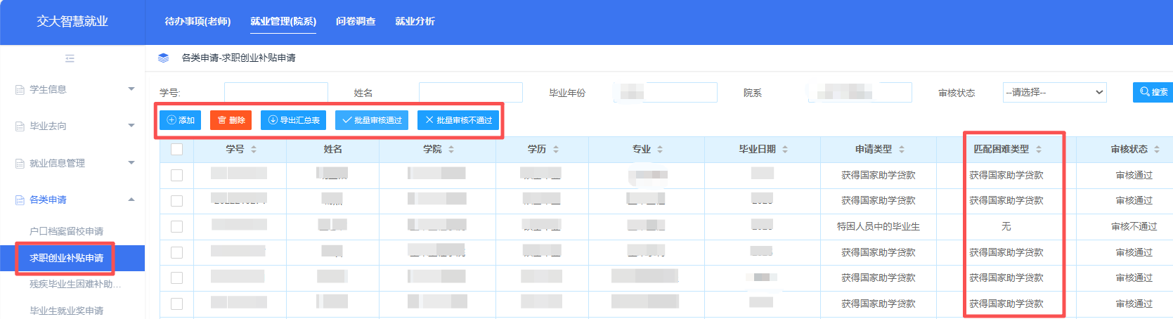 2.核对申请求职补贴的学生名单,并在智慧就业网导出《xx学院符合补贴要求无需提供证明材料学生明细表》(附件3)和《xx学院符合补贴要求需要提供证明材料学生明细表》(附件4),填写《西南交通大学求职补贴申请汇总表》(附件5)。