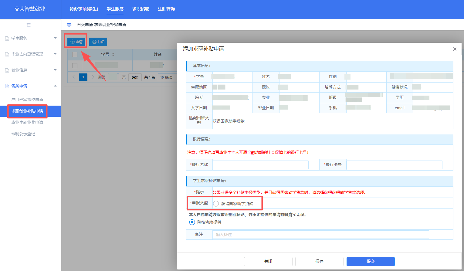 登录西南交通大学智慧就业网,在各类申请中提交求职补贴申请,在“全国学生资助管理系统”中存在有效数据的学生系统会匹配相应的困难类型。未匹配到困难类型的毕业生需要自己选择申报类型并严格按照附件2要求提交证明材料,证明材料需提供原件和复印件(注意材料开具部门及有效时间要求)。
